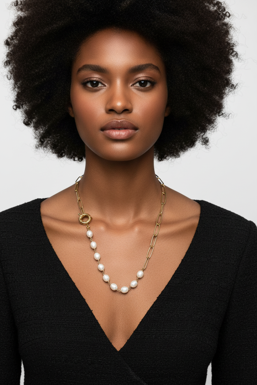 Radiate timeless beauty with the Golden Muse Necklace — a delicate fusion of elegance and energy. Handcrafted with a sleek 18 gold-plated chain and adorned with eight luminous freshwater pearls, this piece embodies quiet luxury.